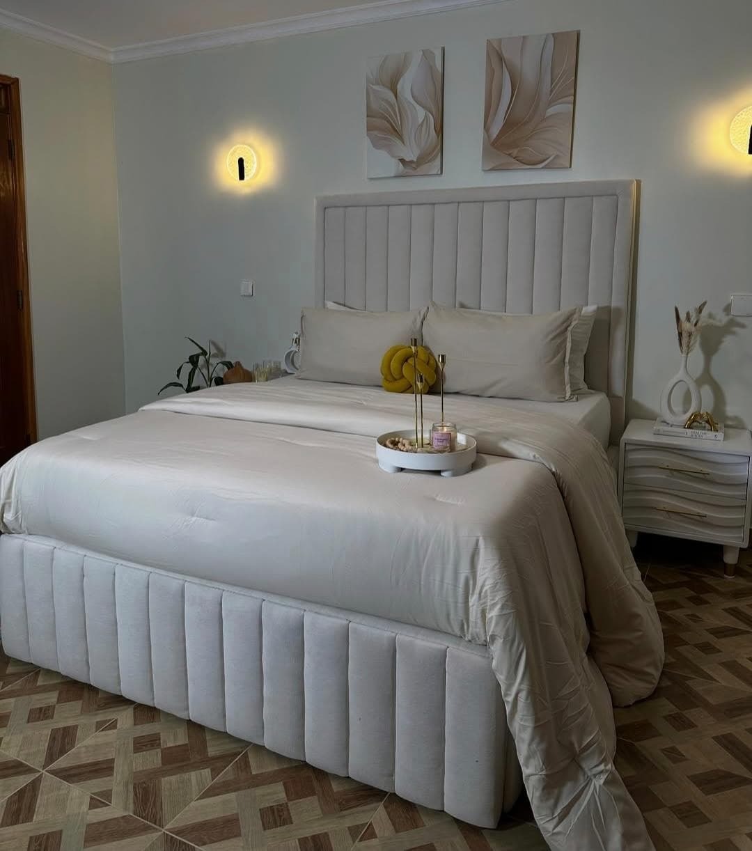 - Boucle upholstered headboard for a modern, cozy touch